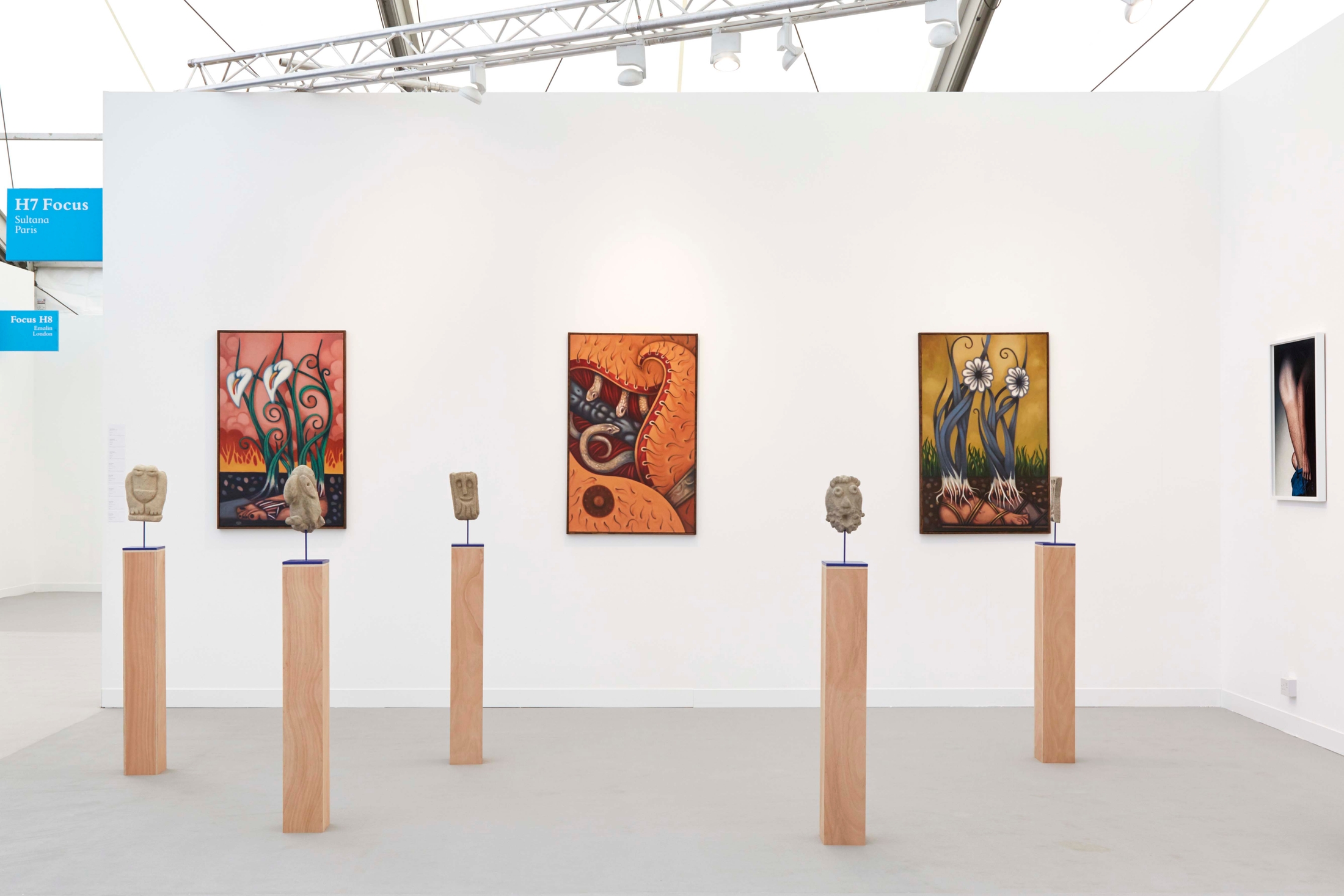 The project features three artists from different cultures and generations. On a wall, paintings by Fitztpatrick, then in the centre some Millagou's sculptures and Pfeiffer buries a whole wall with wallpaper and photographs hung on it.
