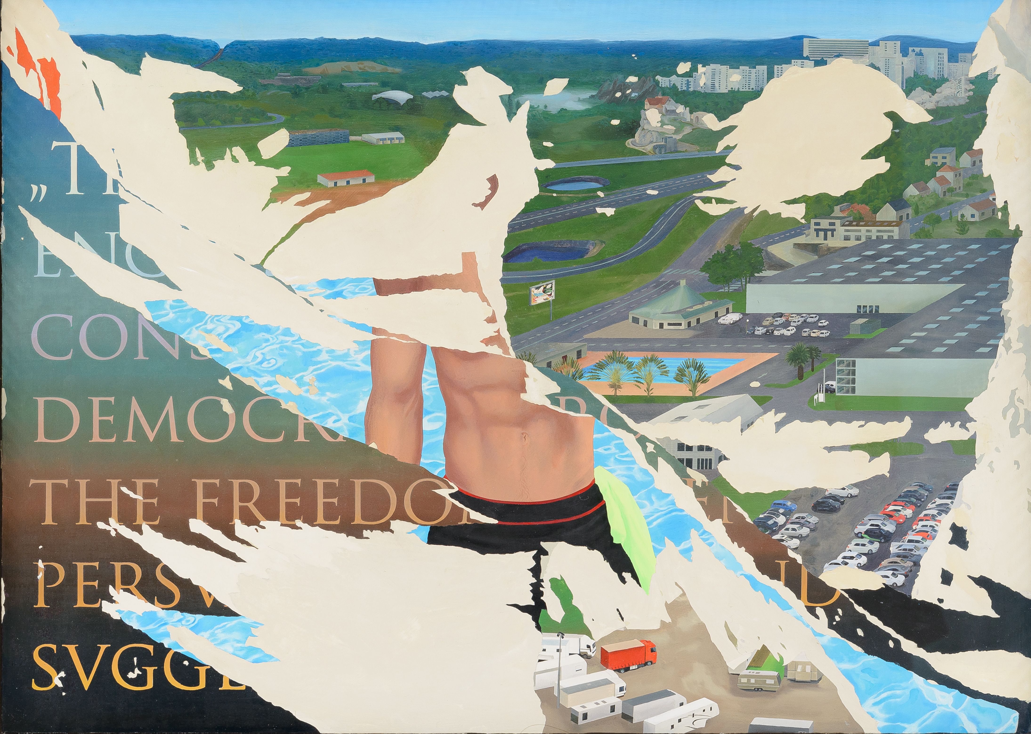His paintings explore, in the finest form, the language of advertisement and social media and how they create desire and fascination. They often refer to the architecture of suburban areas, such as car parks, symbols of a world alienated by consumerism to the point of sacrificing its own existence. With his eclectic references, Jean Claracq succeeds in depicting the ambivalence within joy and pleasure when mixed with the anguish of a world on the verge of collapsing. To this regard, his dystopian view of la joie de vivre presents itself as a new alternative to the divine perception of the world.