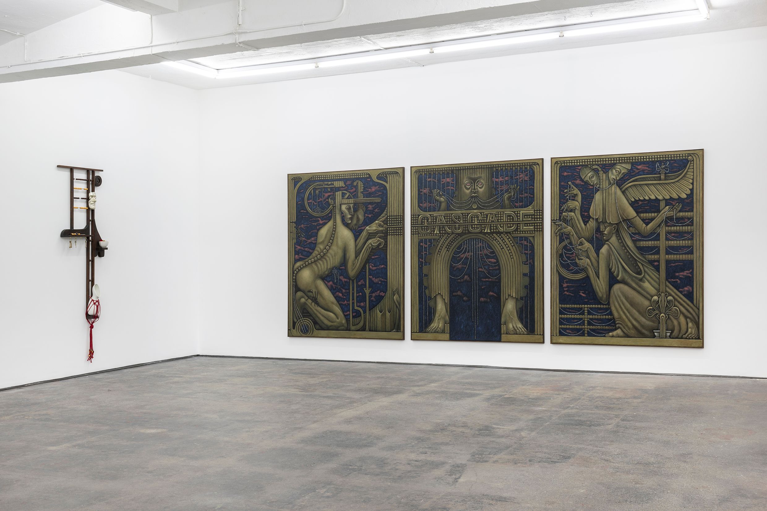 Justin Fitzpatrick works with painting, sculpture and text to explore human consciousness through the prism of biology. He presents us with elaborate and fantastical paintings of mysterious figures and mutating forms; sinewy lines evoke art nouveau detailing, fused with gothic and macabre elements. Much of his work contains figurative elements transformed into static, infrastructural ones: the human body becomes mechanical, forming spaces to inhabit or transit upon. Highly stylised musculoskeletal structures seem visible through the skin, while ornate, vegetal forms and insects link his subjects to the earth, or point towards the interconnectedness of different species. Fitzpatrick’s work is informed by the science around cellular structures (in particular, mitochondria), metaphysical poetry, mythologies, and an array of archetypal figures, often viewed through a lens of class and sexuality.