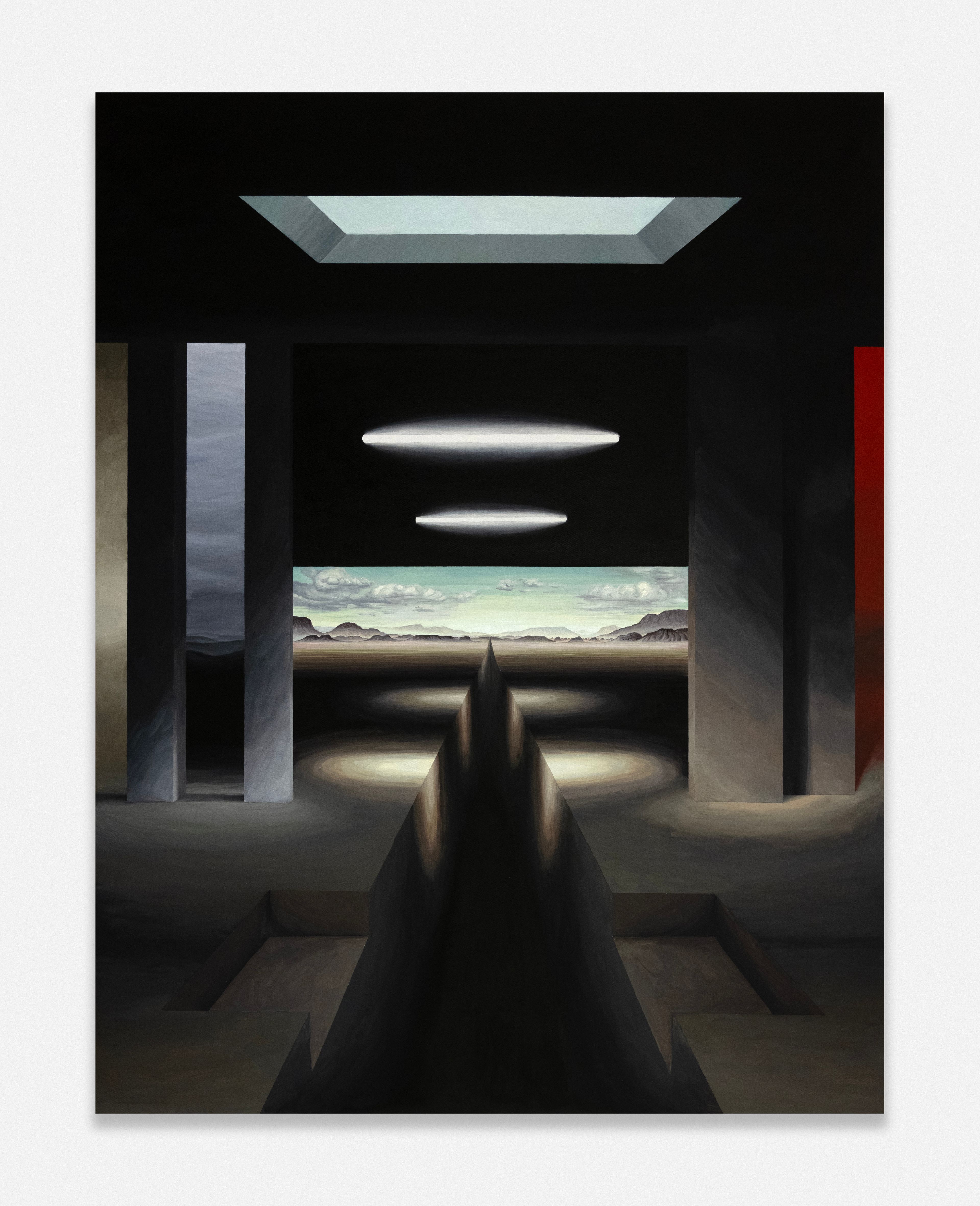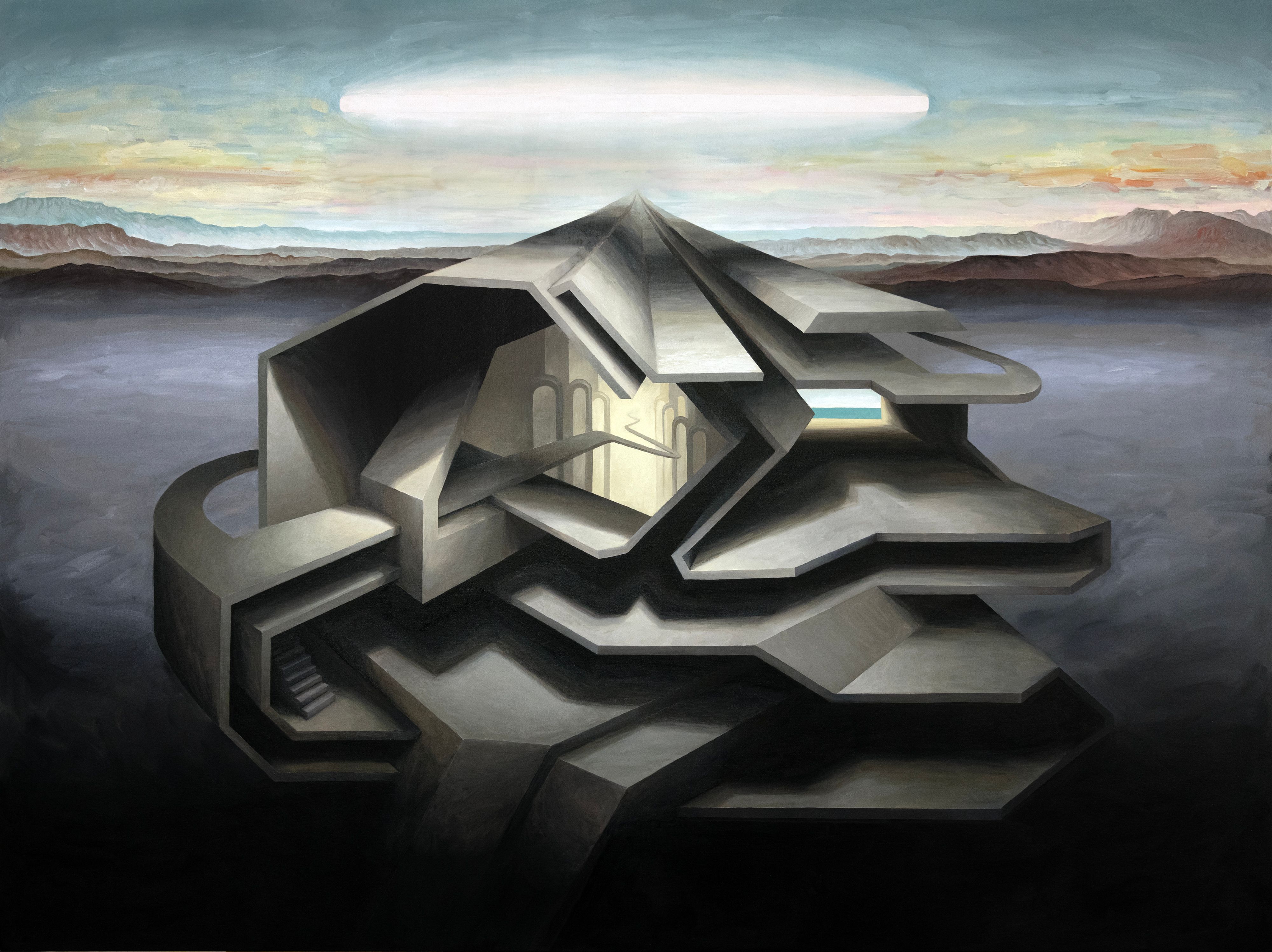 Louis Le Kimâs paintings are deeply influenced by his explorations of abandoned and active industrial sitesâsteel mills, electric and nuclear power plants, mines, oil fieldsâas well as subterranean urban networks, frontlines, archaeological sites, and hostile natural environments such as deserts and volcanic regions. Le Kim transposes these architectural fragments, gathered over the course of his explorations, into monumental and fictional environments set within deserted landscapes. Louis Le Kimâs works provoke a strange kind of vertigoâan attraction to the sublime tinged with uneaseâreflecting both our thirst for spectacle and our growing fear of collapse.