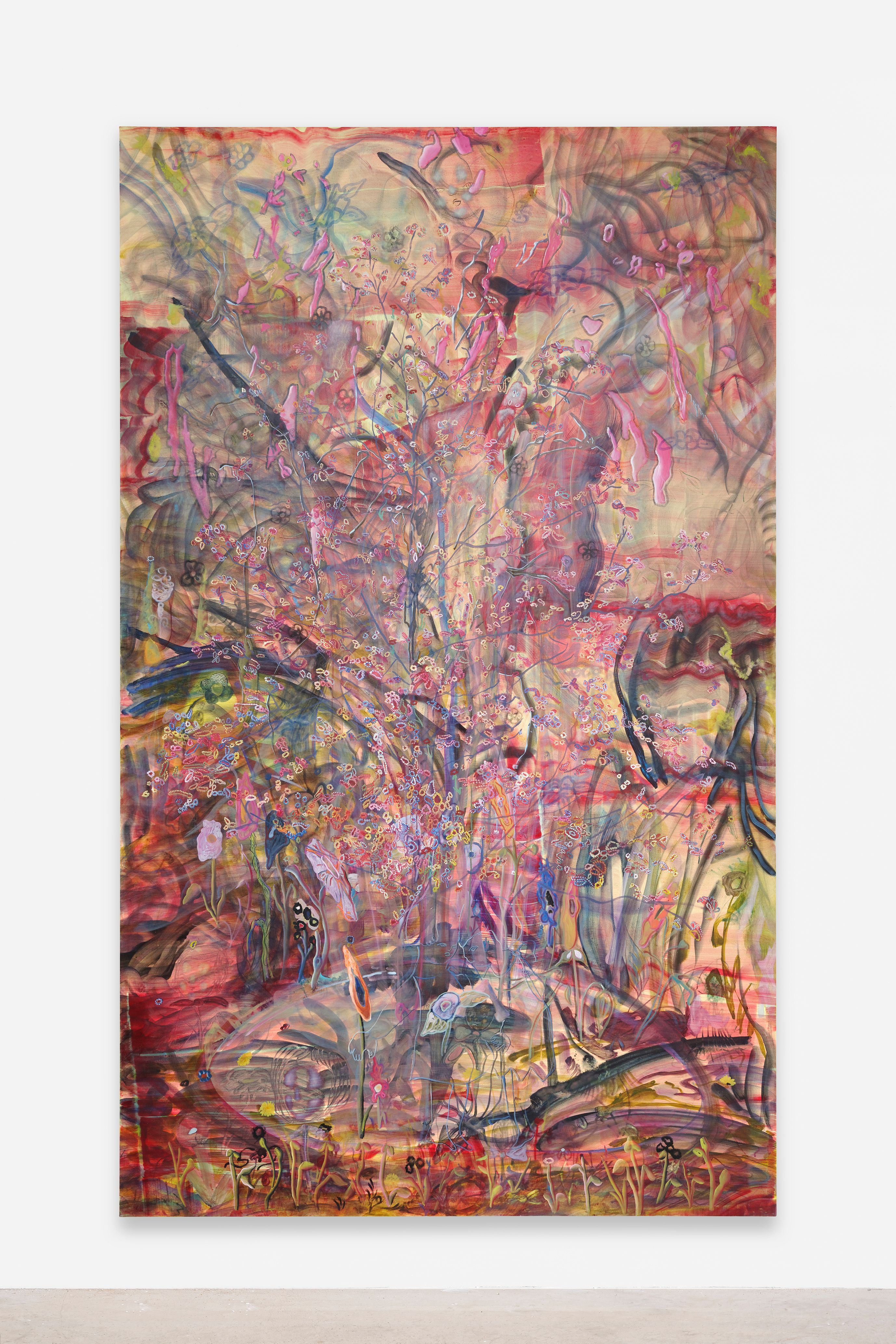 In Matthias Garcia's works, nature and humanity intertwine into blooming, jubilant landscapes. In his worlds on the fringes of reality, lascivious nymphs cohabit with two-headed mermaids, flowers adopt cherubic faces and discreet little girls wander among the climbing plants. His evanescent figures melt into luxuriant vegetation, where darkened colors are awakened by bright pigments. Stylistically, Matthias Garcia's paintings evoke surreal, psychedelic landscapes. References to art history - whether to Francisco Goya, Odilon Redon or Jérôme Bosch - hybridize with those to popular culture, such as Hans Christian Andersen's fairy tale The Little Mermaid, manga culture and video games.