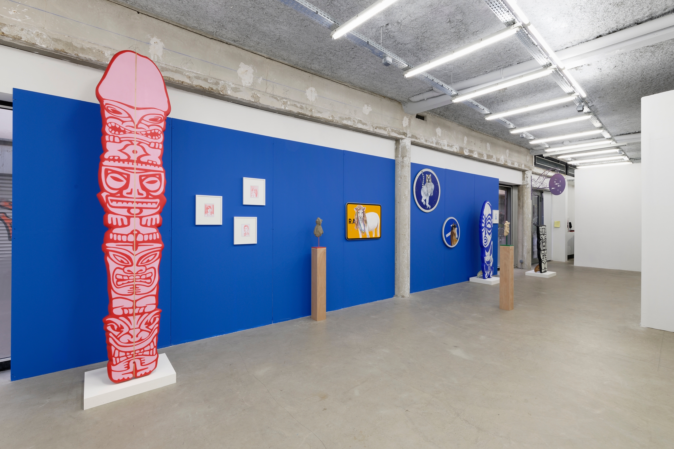 L’ensemble des sculptures surfables sont réalisées à partir des matériaux (bio-mousse, fibre de lin, résine bio sourcée...) et des techniques (channel, finless, rockers, tails...) issus du savoir-faire shaper1. Cependant leur nature est contrariée par l’envie de déplacer la question de leur performance du côté du rendu formel. Irrégulières, disproportionnées, voire asymétriques, elles se tiennent debout, font face et malgré leur handicap criant semblent attendre qu’on se décide enfin à se jeter à l’eau, ventre à plat. Face au mur de A Swingin’ Summer, une communauté est rassemblée. Peter (Drouyn), Miki (Dora) ou Rod (Madchado), croisent d’étranges figures, mélange de tikis2 et de cartoon, épinglées comme on montre les statuettes ancestrales de cultures lointaines dans les musées . Moulées dans le sable d’une plage, elles auraient le pouvoir de faire advenir les bonnes vagues. Prier pour la possibilité d’un tube. Brebis Janis Joplin, lémurien Kurt Cobain, cheval Lee Hazlewood, sont aussi de la fête (et les tubes adviennent). Peints grossièrement sur des panneaux de signalisation, ils veillent à ce que rien ne devienne vraiment normal. Ils sont pour Olivier Millagou les apparitions hallucinées d’un monde sauvage, une vision hippie dans laquelle les postiches valent toutes les identités. On se situe sur un territoire de croyances, un terrain de jeu où énoncer les choses revient à les rendre réelles.
