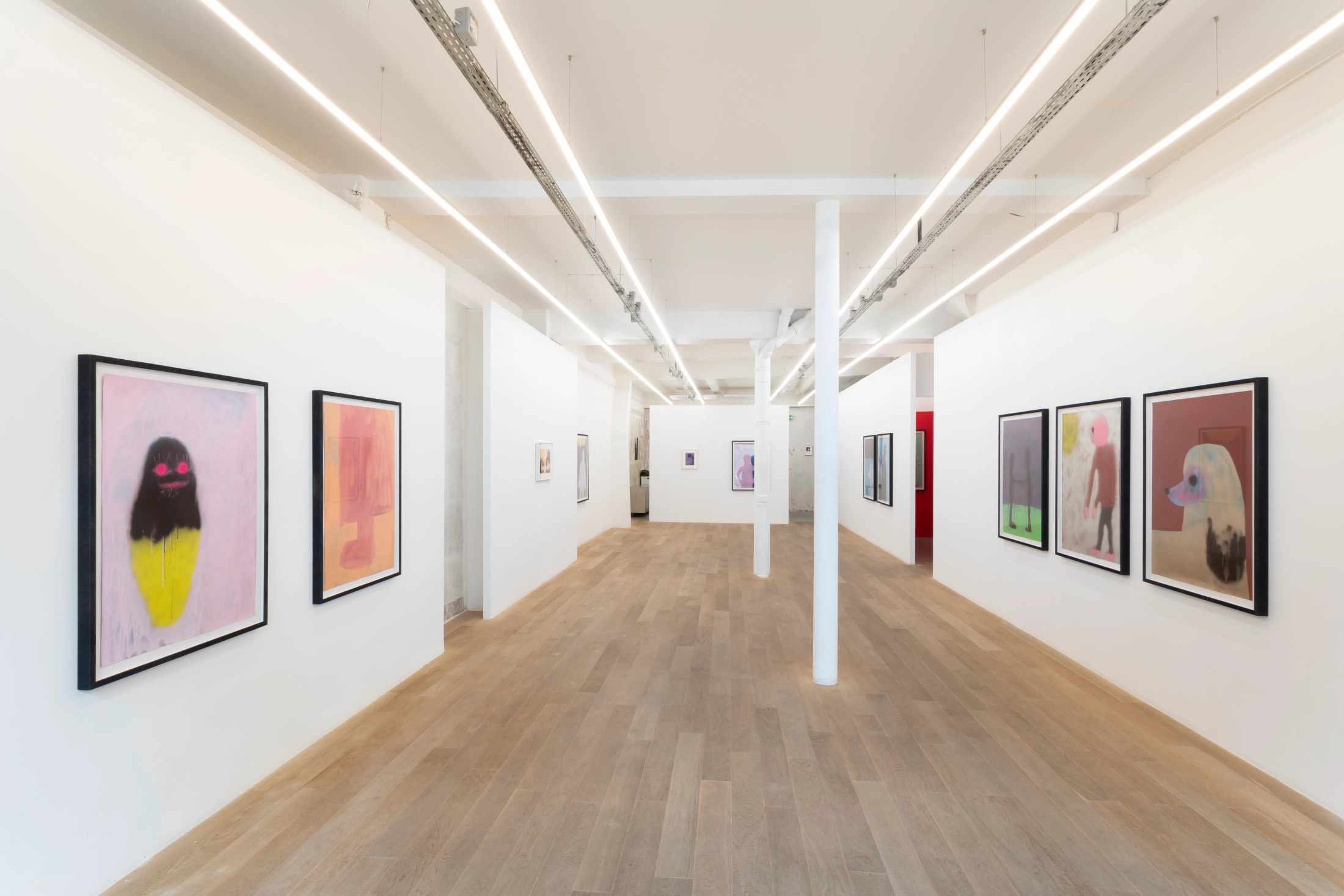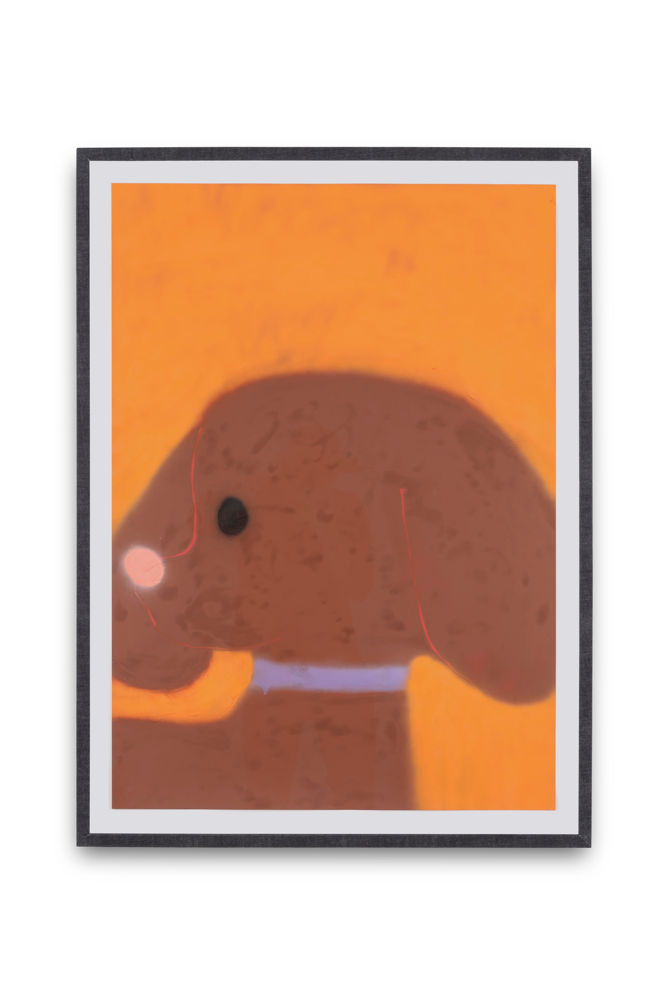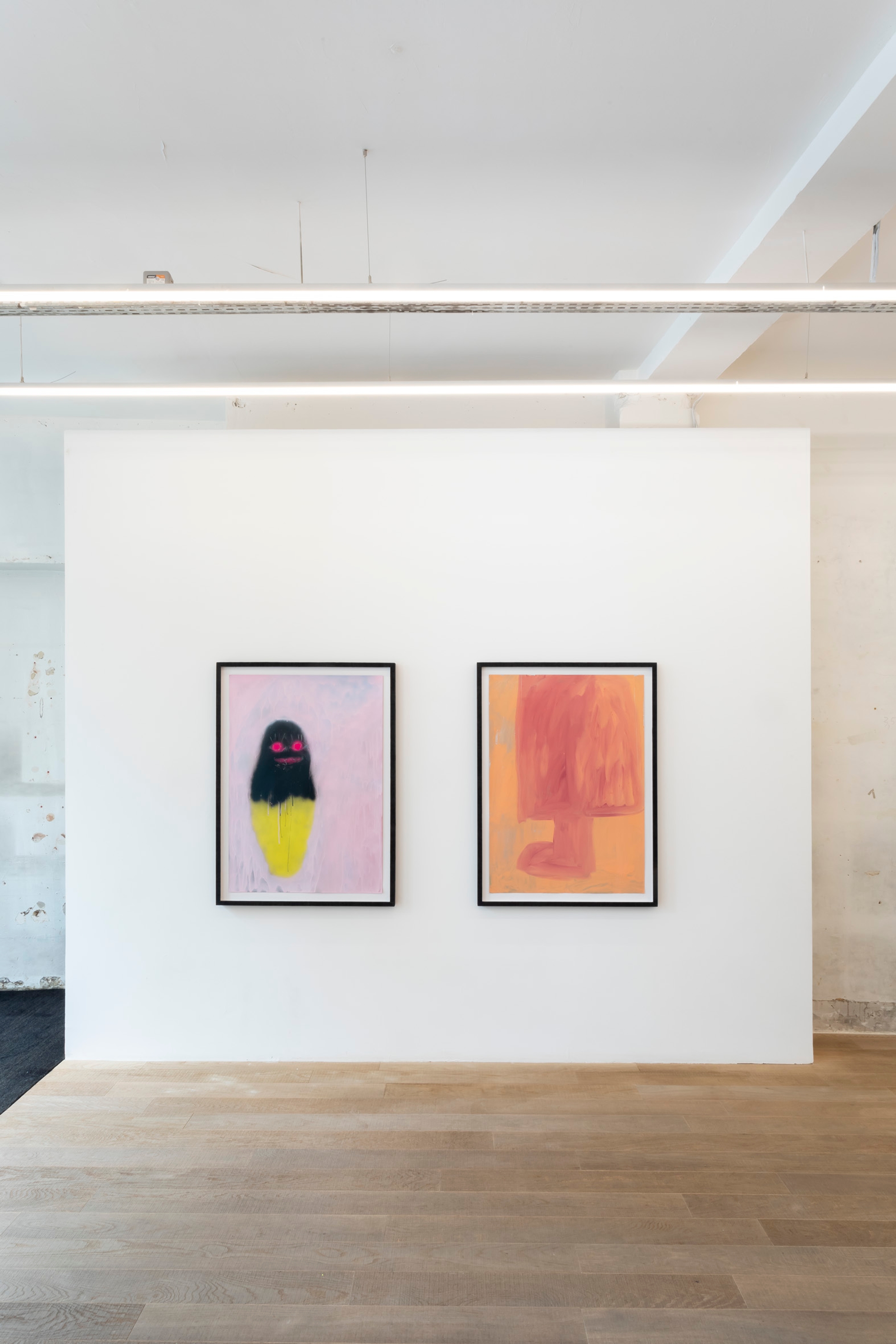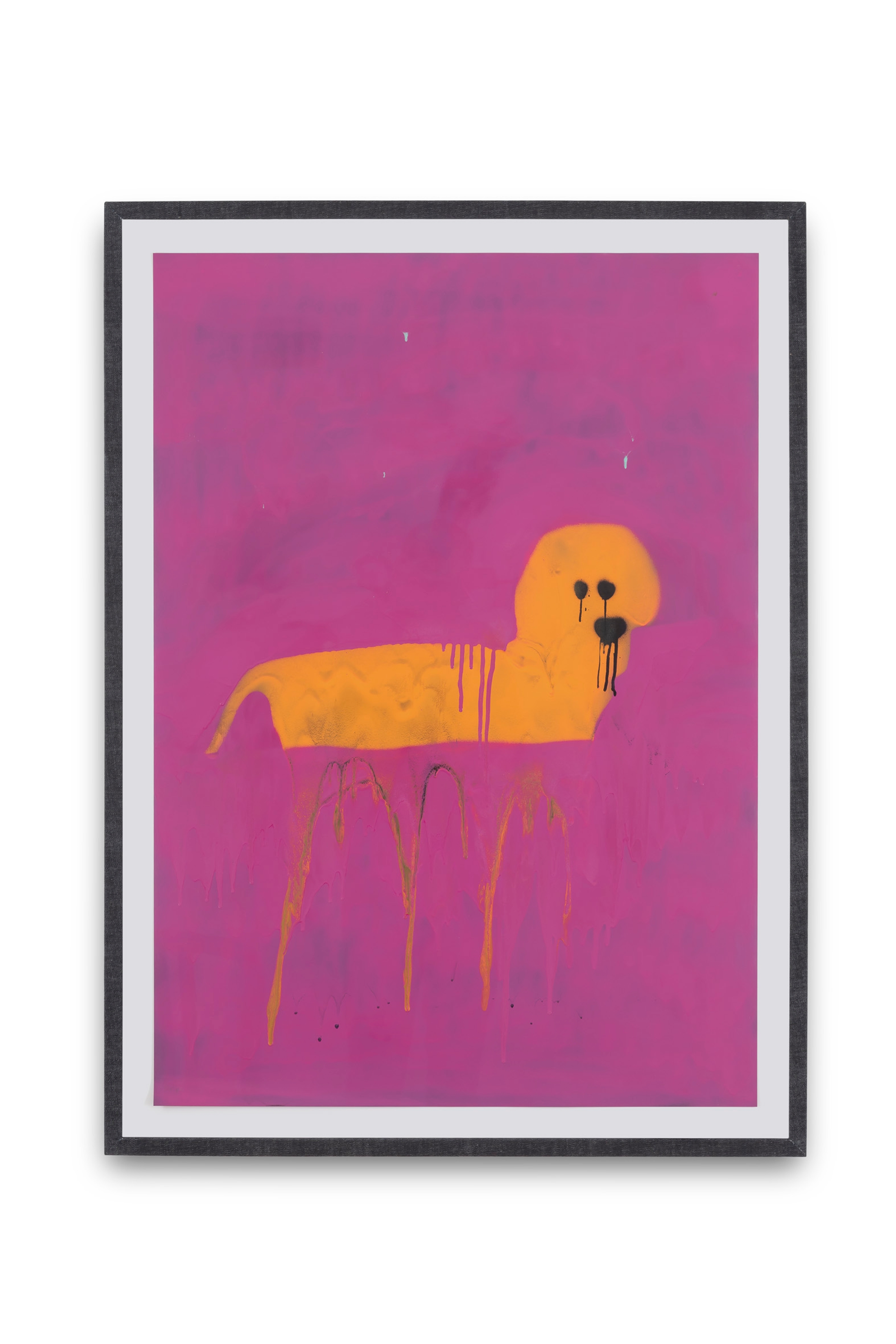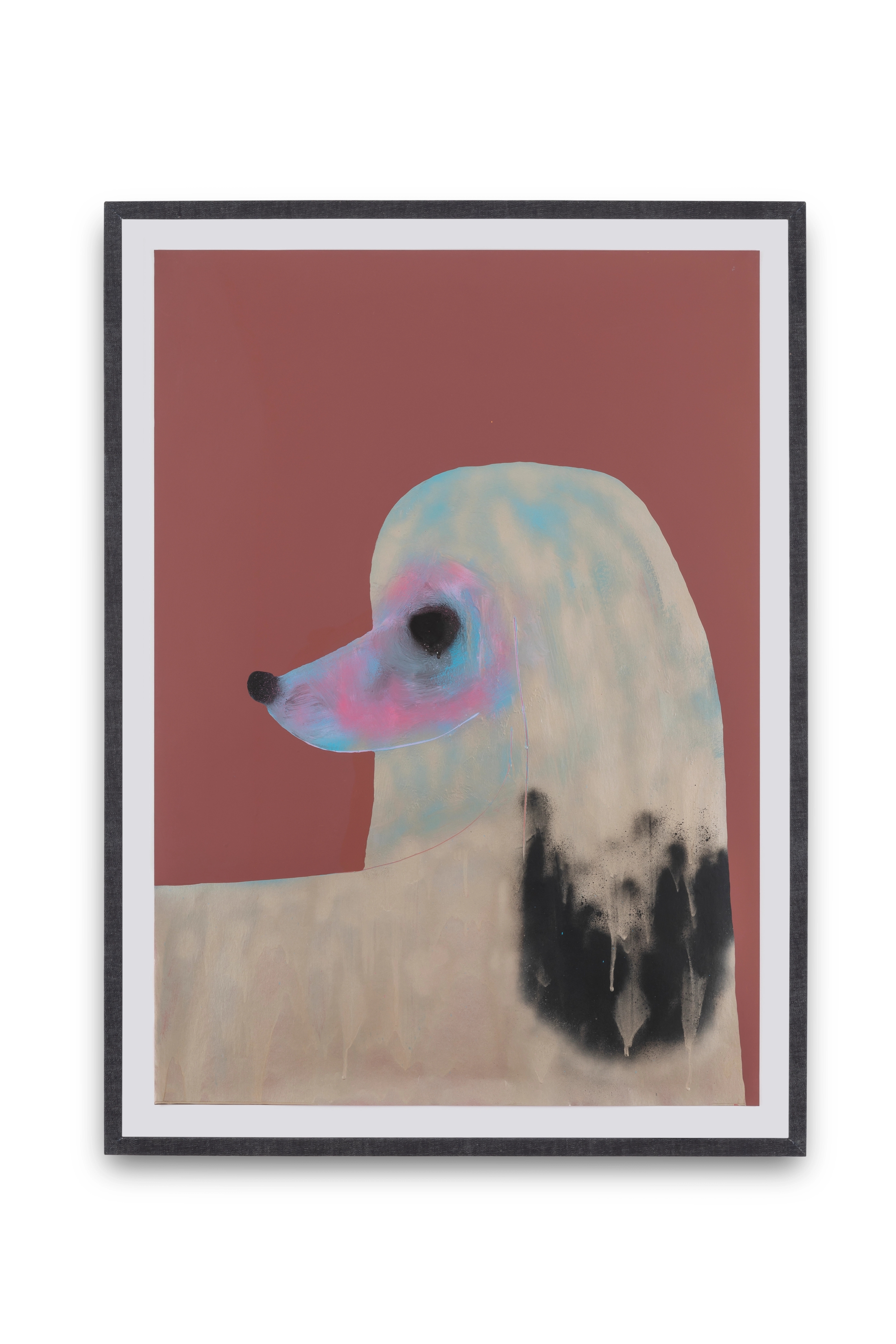 The repetition of certain motifs, sometimes almost identically â for example, this double portrait of dogs in profile, with contrasting nose and collar â shows a perseverance that seek neither virtuosity nor perfectibility, but rather a sincerity that can surely be related to a punk ethos. âCan one be punk when one likes to work diligently in the studio?2ââ is another question Amy Sillman could have asked Adrien Fregosi. Looking at his acid-toned paintings made from scraps, his clumsy characters with their feet too big, their arms too long, his poodles too well groomed, I think he combined in the studio both ridicule and repeated effort, clumsiness and care.