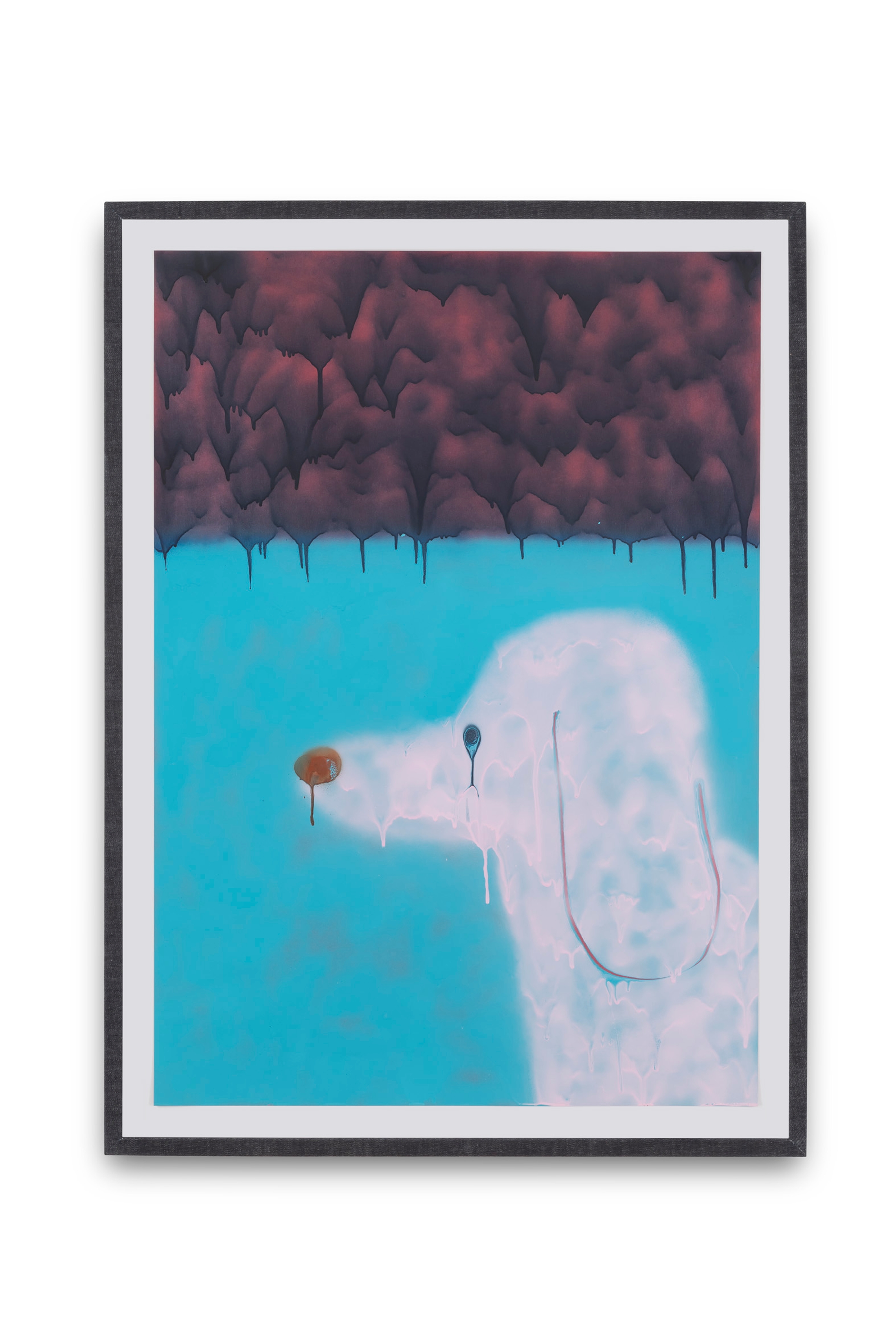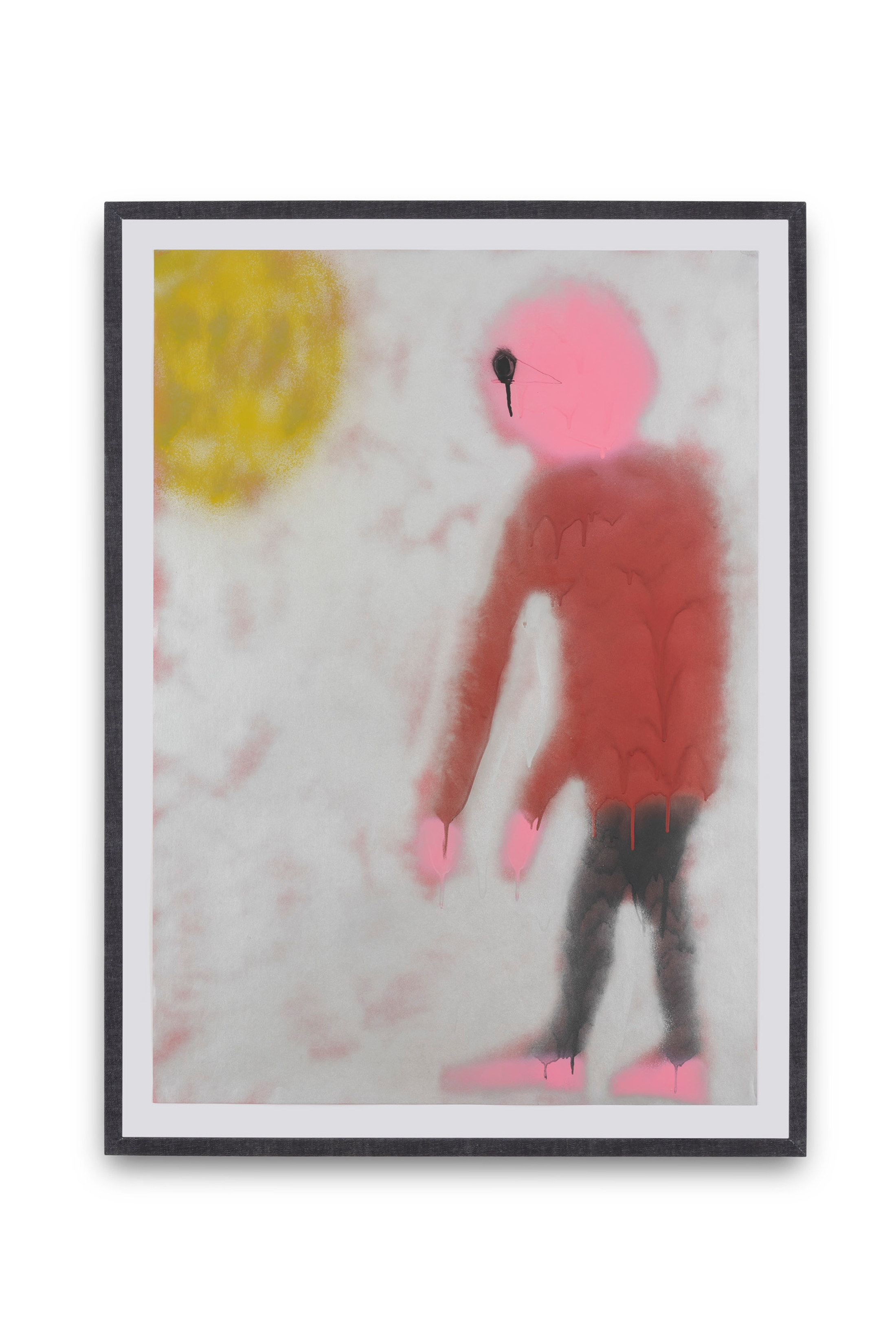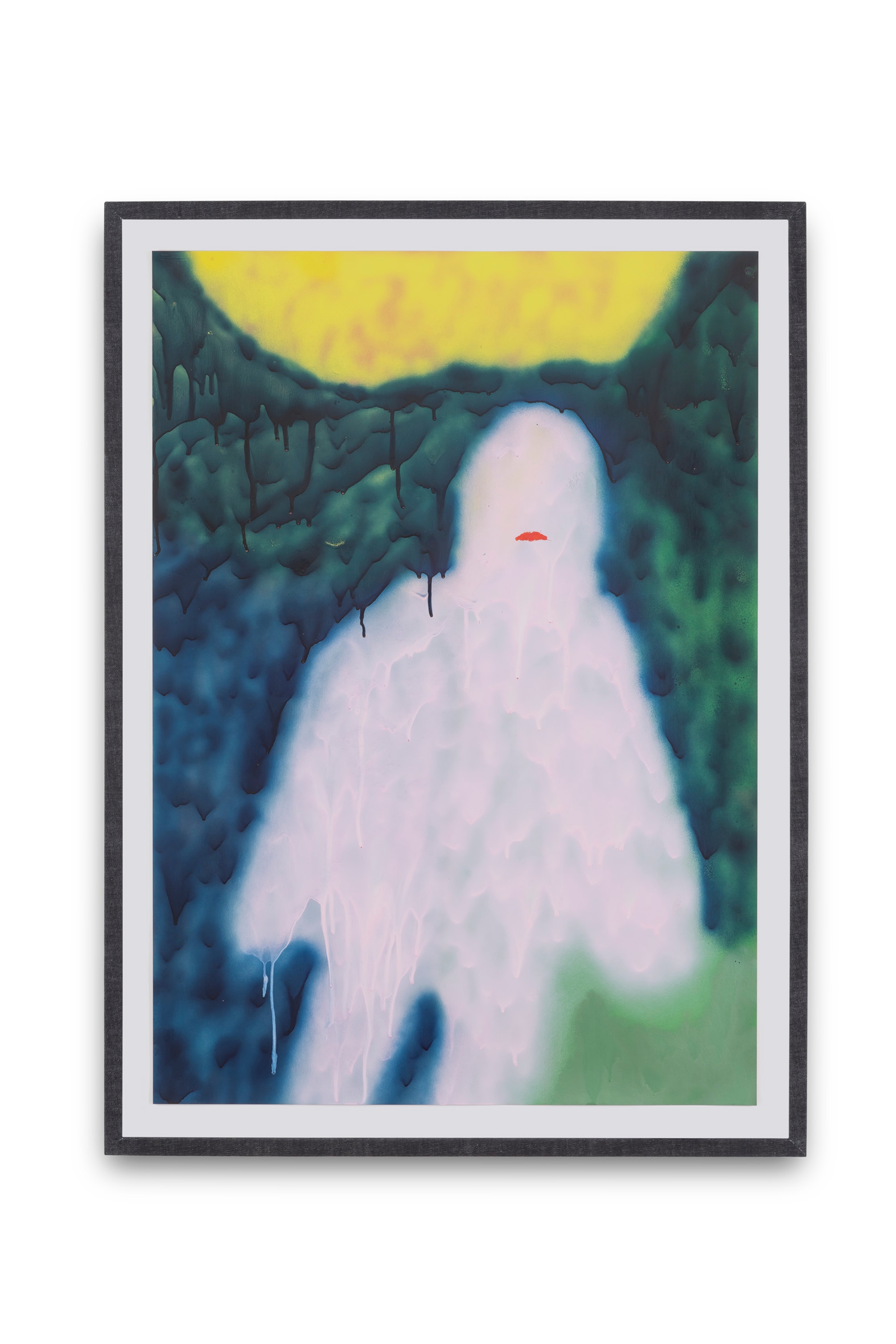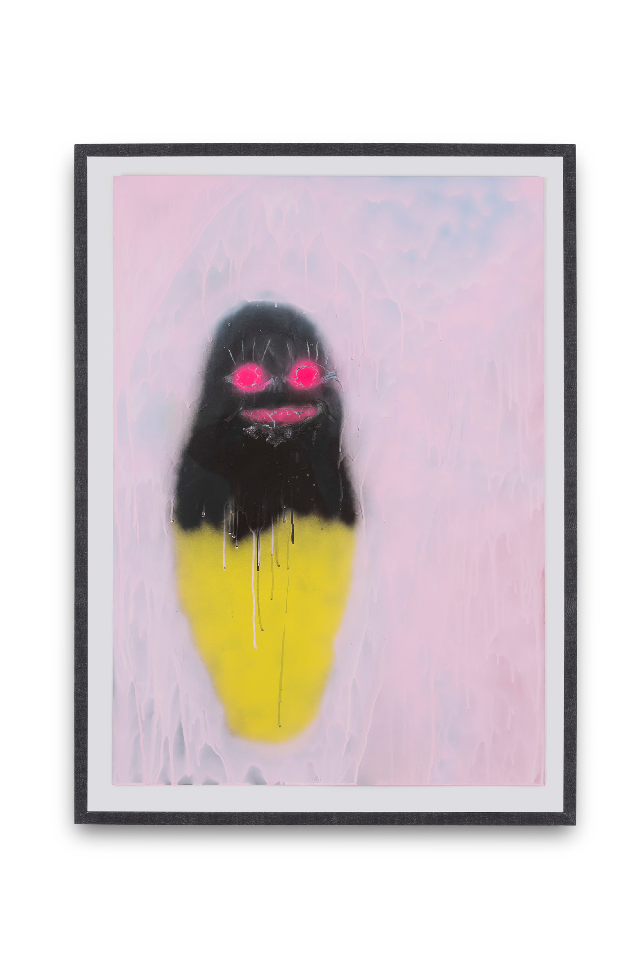 I call them even more willingly âpassersbyâ as Adrien Fregosiâs color, dripping and drawing work first flourished in the streets. In Grenoble, during the 2000s, he made graffitis under the pseudonym PUZL and stood for, in particular with the independent space Going Blind, an alternative scene inspired by American counterculture (from cartoons, to skateboard and zines). Things began to change in 2013, after moving to SĂšte (where graffiti was more severely reprimanded) and being diagnosed with cancer. His practice moved to the studio while he kept the habits developed in the street: spray cans to apply paint, the âmake doâ with what is available (he would collect materials and tools about to be thrown away) and improvisation (driven not by graffitiâs timing but by the energy available at that moment). In the studio, he also seems to have reappropriated the gestures of covering and erasing, that are to be expected on any drawing appearing on the street. The 102 x 72 cm paper sheets in the exhibition are thus disappearing under several layers of spray paint, sometimes supplemented with acrylic paint. In some areas, a drawing scratched on the surface reveals the sedimentation of colors. As airy techniques, airbrush â that Adrien Fregosi used for small drawings â and spray paint inevitably transform the drawing lines. One part gets lost in the atmosphere while the other gets fixed on paper. The characters thus become evanescent, a halo sometimes surrounds them; which doesnât prevent them from dripping. The shapes exist in between a liquid and a gaseous state, they rise and fall as they empty. It is like looking at a cloud: the closer you get, the more the outlines disappear.