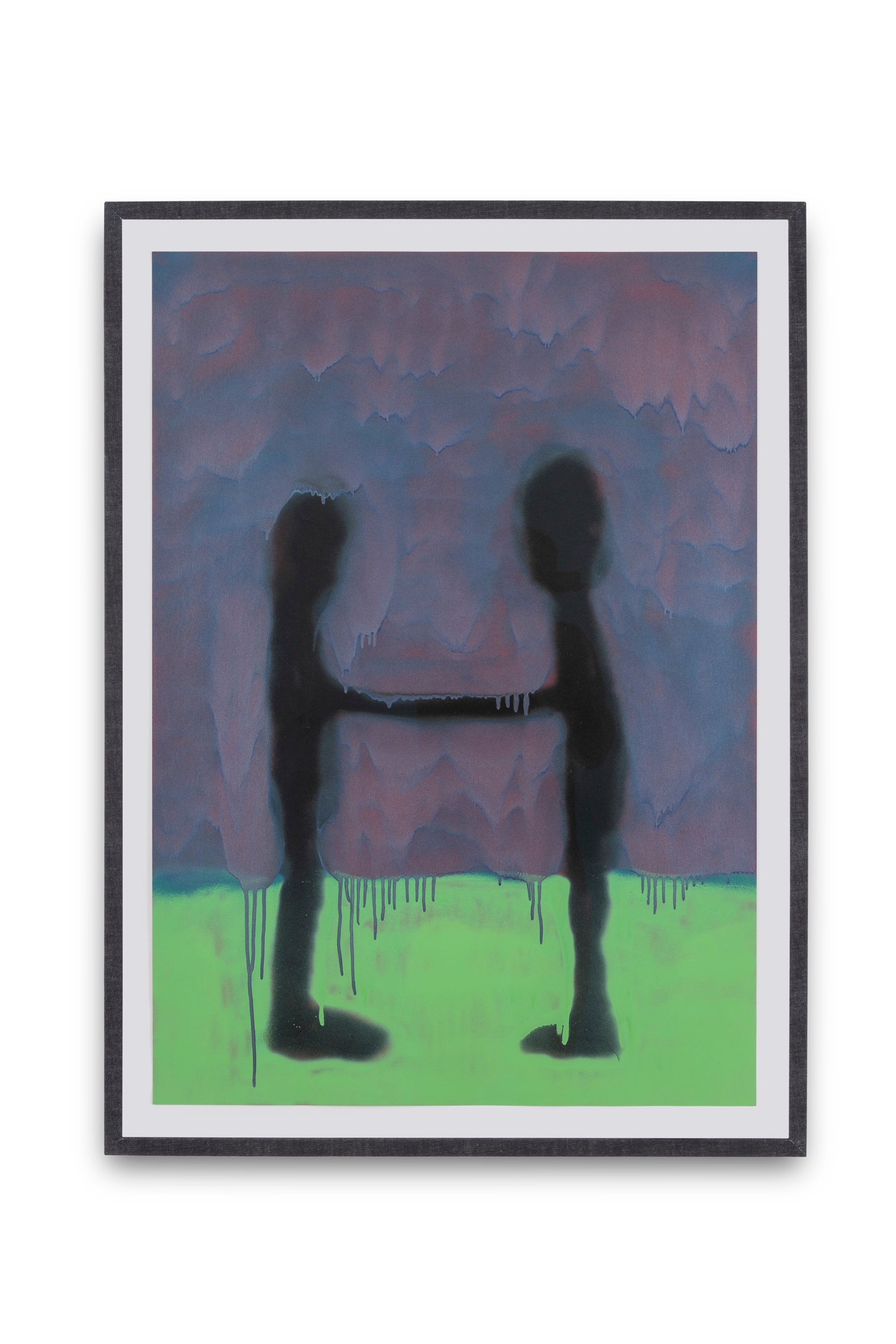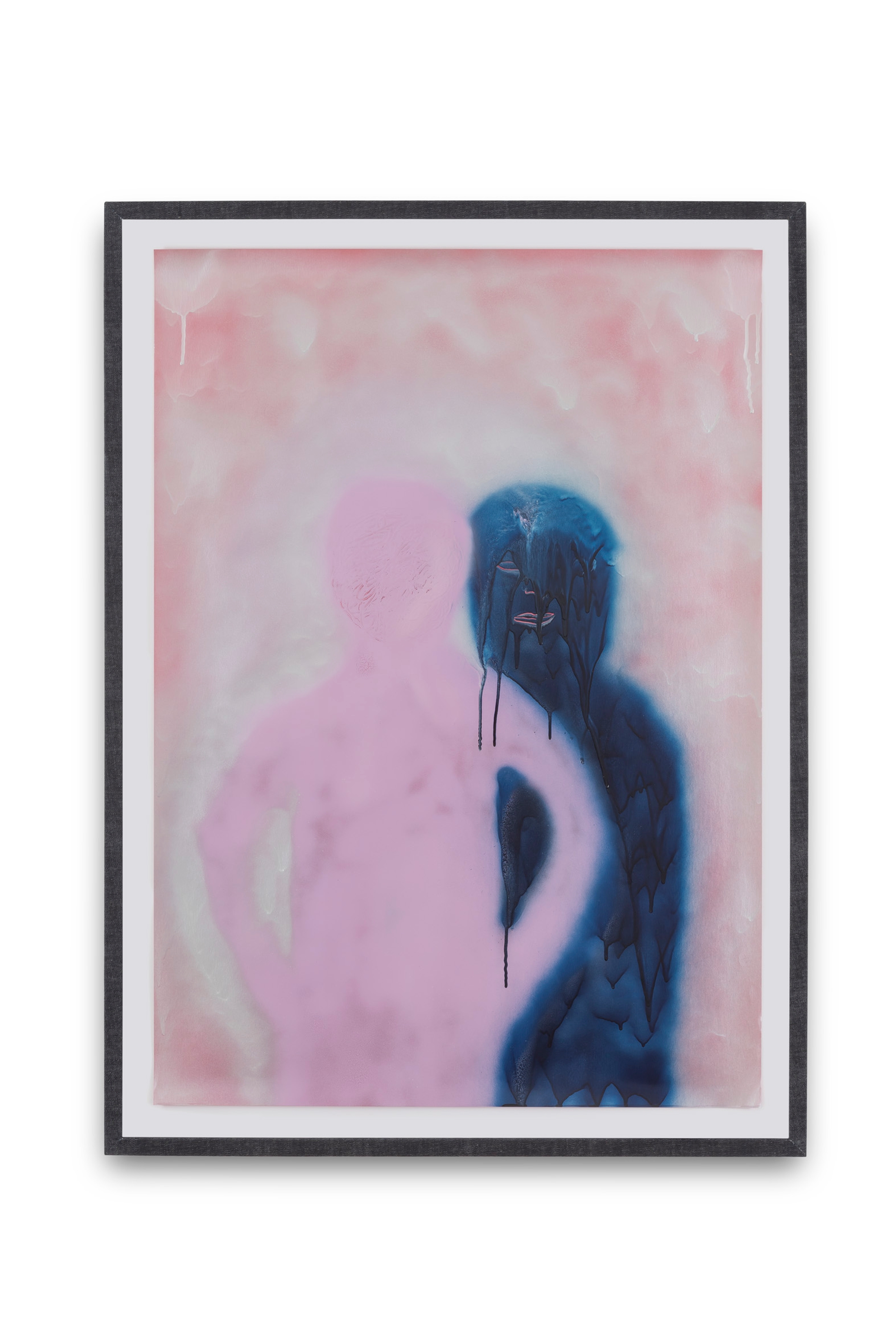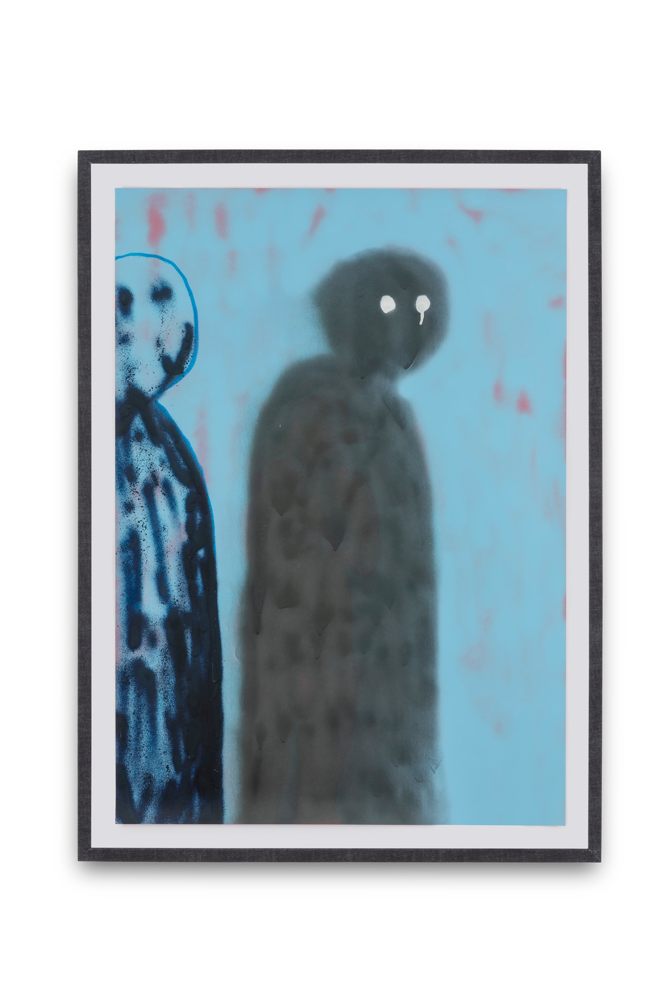 On one of the paintings on paper from 2023, two figures with neither arms nor feet â one is blue, the other is red â float on a turquoise background. Their eyes are two pink dots staring at us. This time, theyâre not dripping. When I saw them, I immediately thought of those big shadows with their red pupils that haunt Apichatpong Weerasethakulâs film Uncle Boonmee, Who Can Recall His Past Lives. In the film, Boonmee, suffering from an incurable disease, is visited by his deceased loved ones and dreams of his previous incarnations.