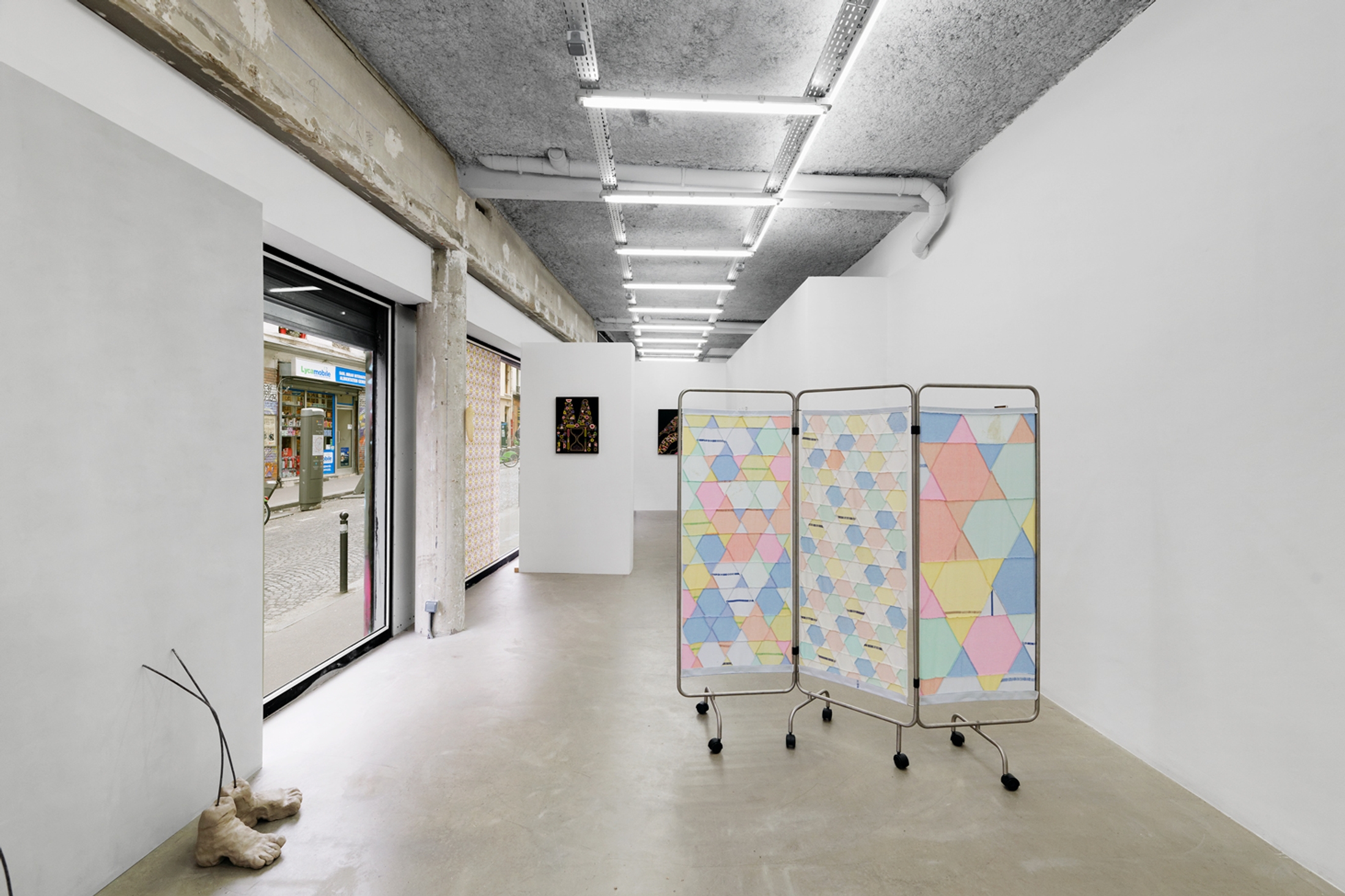 The artists selected here play with Cottagecore tropes to varying degrees. Jesse Darling’s We Tried, 2019, plunges steel rods (typically used to reinforce concrete) into blocky feet of white clay; the sculpture isn’t Cottagecore, though it shares its malaise with the contemporary built environment. Edie Fake’s candy-colored gouaches resemble mosaics against jet-black backgrounds: compositions of sheer reverie, not habitability. Meanwhile, Benoît Piéron’s relationship to interiors is informed by experiences of childhood illness and repeated hospital stays. In Paravent, 2022, a pallid patchwork of repurposed hospital sheets is inset within a clinical “privacy screen”—too insubstantial to offer any genuine seclusion—while the wallpaper panel Baldosas Inmaculadas, 2012-2022, slyly merges medical iconography and decorative patterning in the style of William Morris, who a century and a half ago advanced artisanal handicraft as a corrective to the alienation of industrial labor. Cottagecore's critique of modernity, while substantive, also has its limits as a trend, which—considered from this later moment in the pandemic—already seems like a relic of a bygone age.