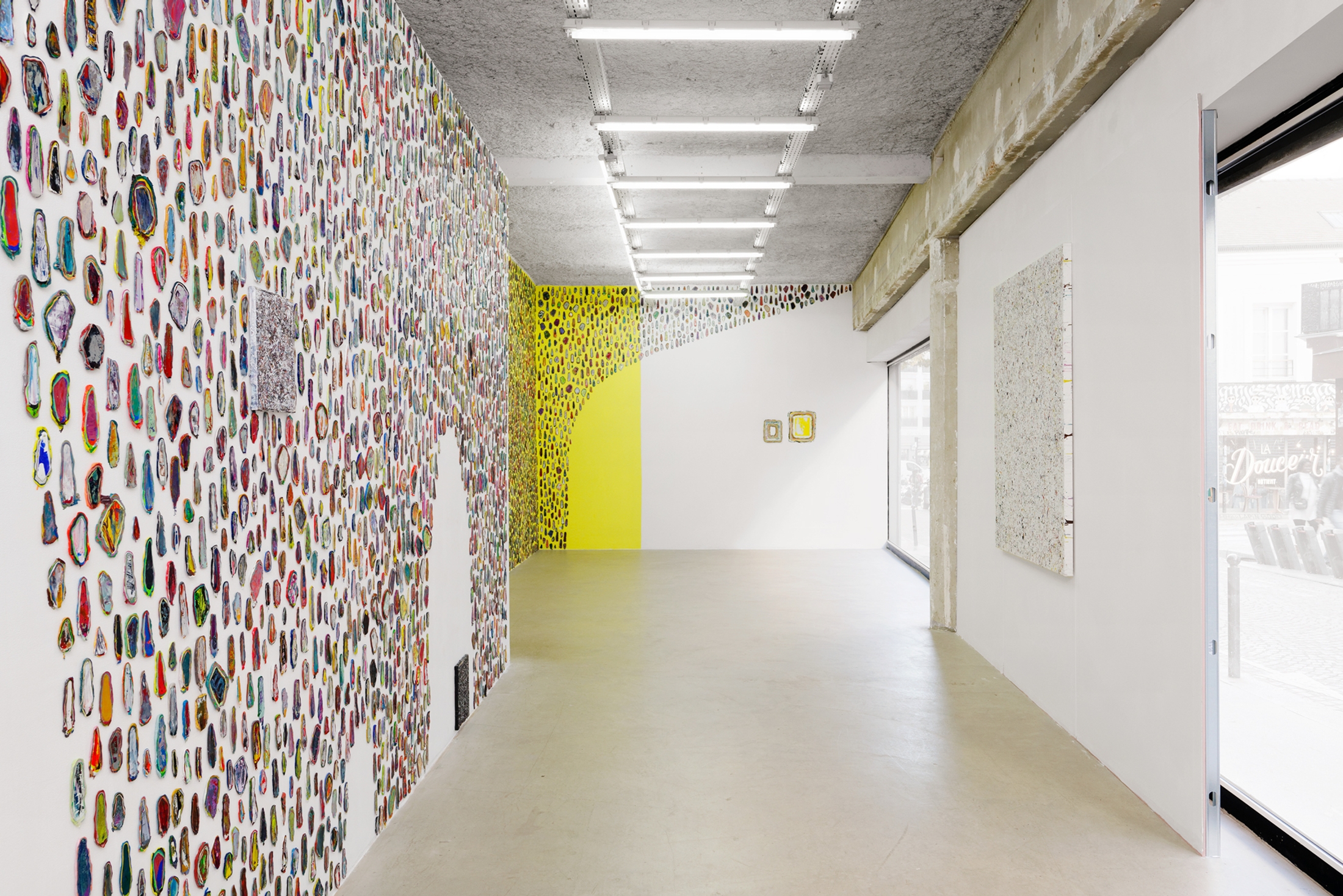 Landscape can be a filter to help the artist thinks about the process of destruction and reconstruction in his work. The centerpiece of the show is a multi-wall installation comprised of thousands of individually molded pieces of acrylic paint called, Palette Knifeheads. The Knifeheads are artifacts of the studio that draw attention to their process and materiality while doubling as fantastic tools that evoke arrowheads or geological forms. The center of each Knifehead depicts details, gestures, colors, and marks culled from the language of 20th century painting like expressionistic brush strokes reminiscent of Abstract Expressionism, Impressionist daubs, color fields, monochromes, patterns, fingerprints, the color interactions of Josef Albers, Mondrian-ish geometries, etc. These moments are caught and frozen as if in amber; they are the building blocks with which Giordano continues to develop, but also relics that may be better left for dead. The installation incorporates doors, portals, and rips which suggest another place can be entered through the work. Paintings mirror each other and the Knifeheads all have twins as a result of a process in which the work is sliced open to create two halves. Doubling occurs throughout the exhibition.