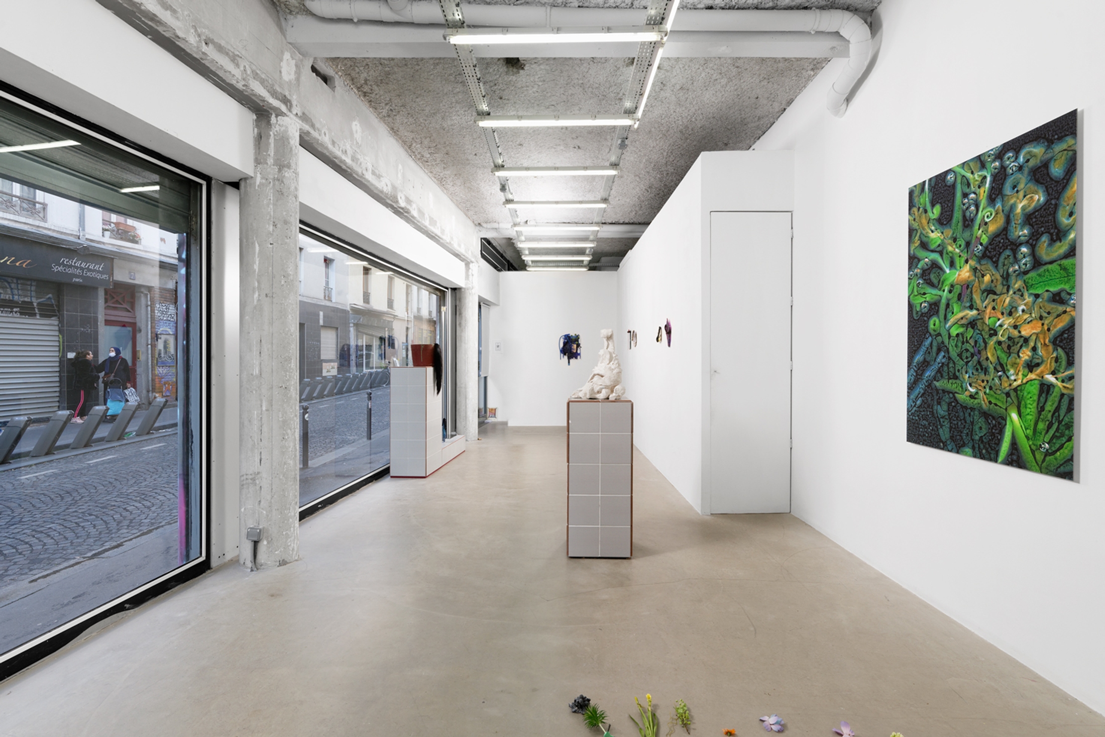 Found detritus, experimentation and chance are all fundamental elements in Bettina Samson's work. Accident is an integral part of her creative process and her pieces are often the result of an unintentional gesture. Some of the works presented in the exhibition are made of ceramic, a material that the artist deliberately approaches from a non-specialist's point of view. She plays with the chance of the material and the unforeseen events that can occur during the firing phase. Two ceramic sculptures placed on tiled bases with a mesh pattern, Mesh Sculpture #I and #II, occupy the center of the space like small architectures standing on the border between the rational and the magical.