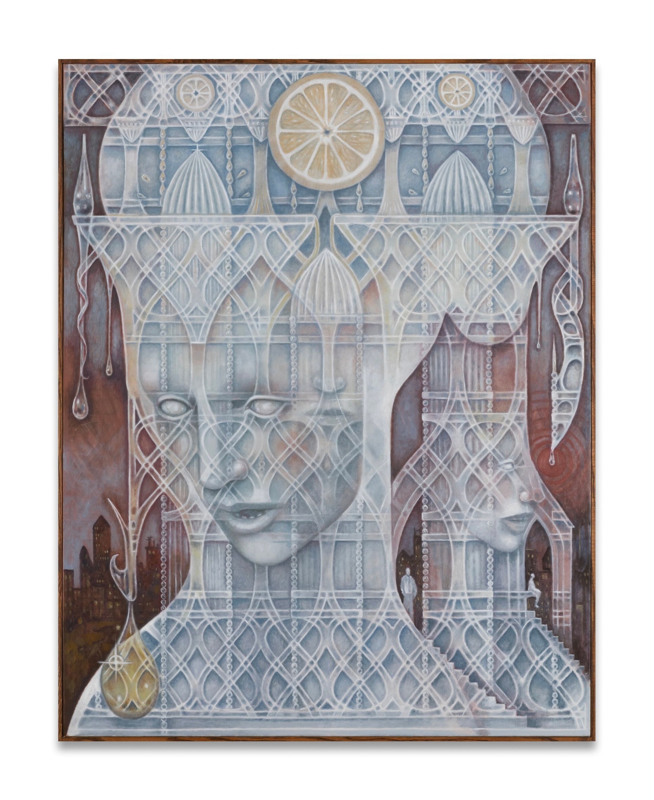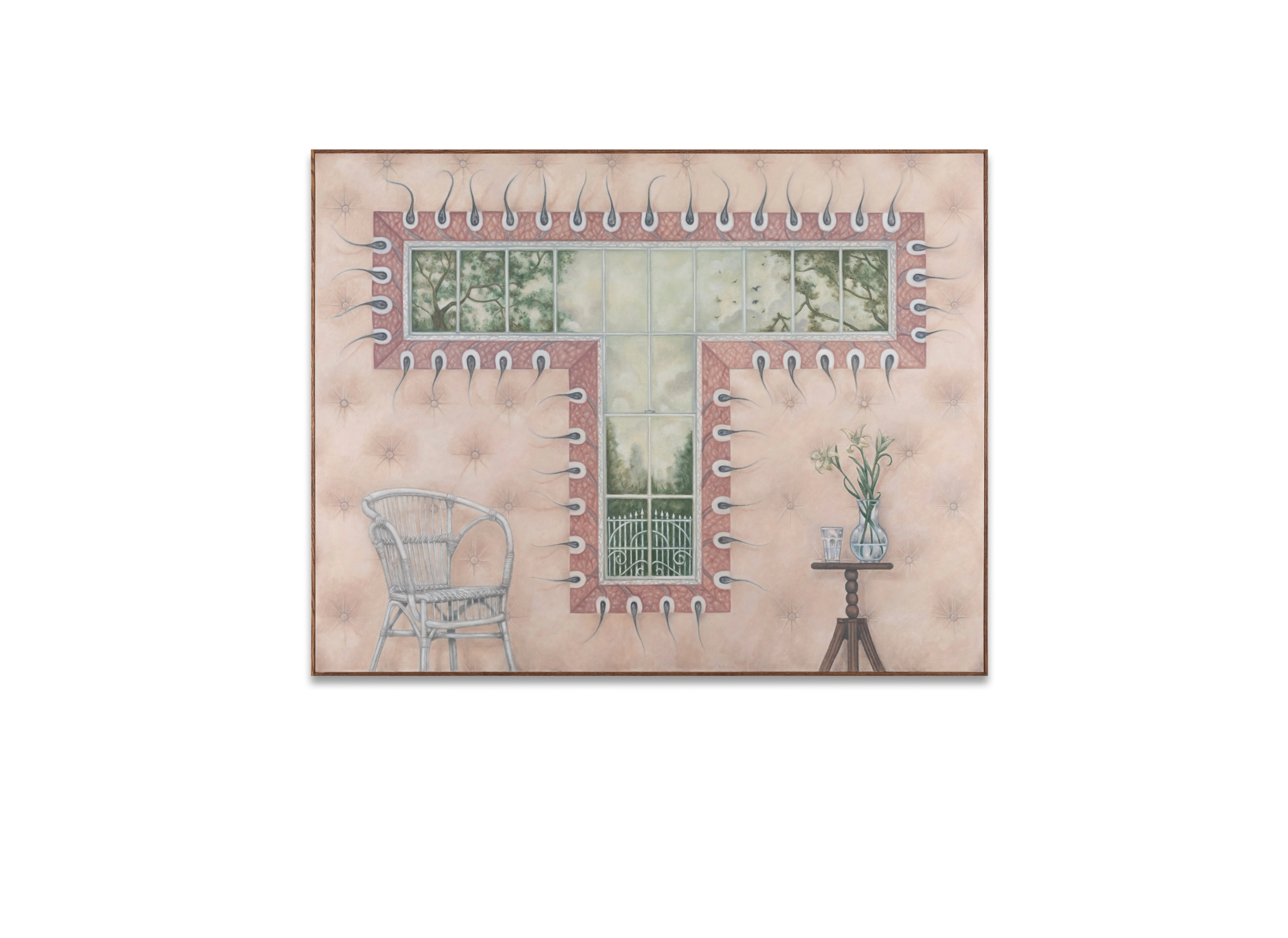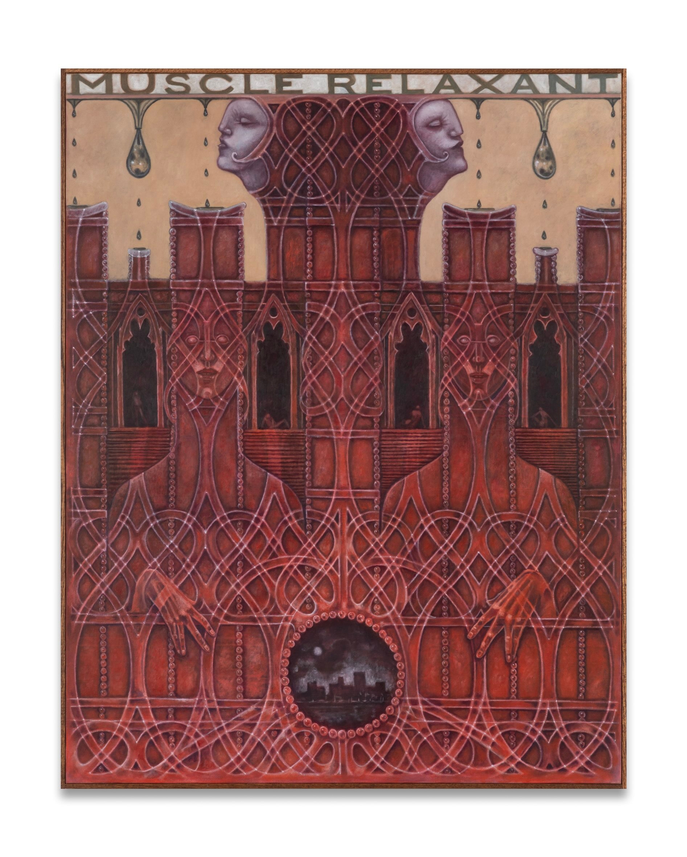 Dans cette série de peintures, la complexité des motifs et l'obsession du détail suggèrent à la fois le plaisir et l'anxiété. Ils font écho aux stratégies visuelles de la Décadence, à sa fascination pour le déclin et ses visions apocalyptiques. Les formes, qu'elles soient architecturales ou organiques - nerfs de verre, fibres musculaires, orties, acide citrique et structures brisées- évoquent une matière marquée par la corrosion et le contact. Dans ces compositions, les ouvertures fonctionnent non pas comme des seuils à franchir, mais comme des espaces où demeurer. Elles rappellent, dans leur logique visuelle, les stigmates de la mystique catholique, ces éléments concrets qui invitent à la méditation.