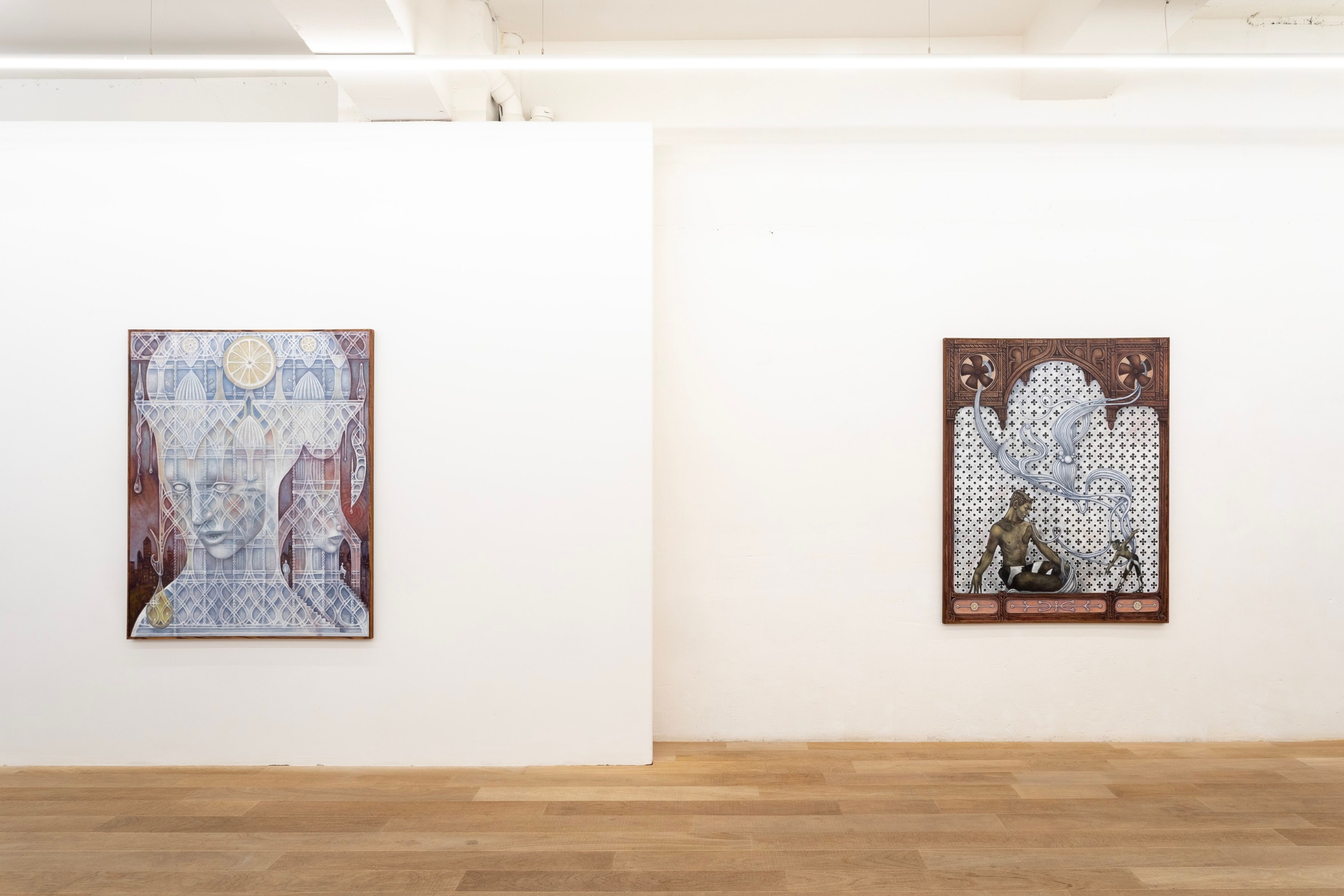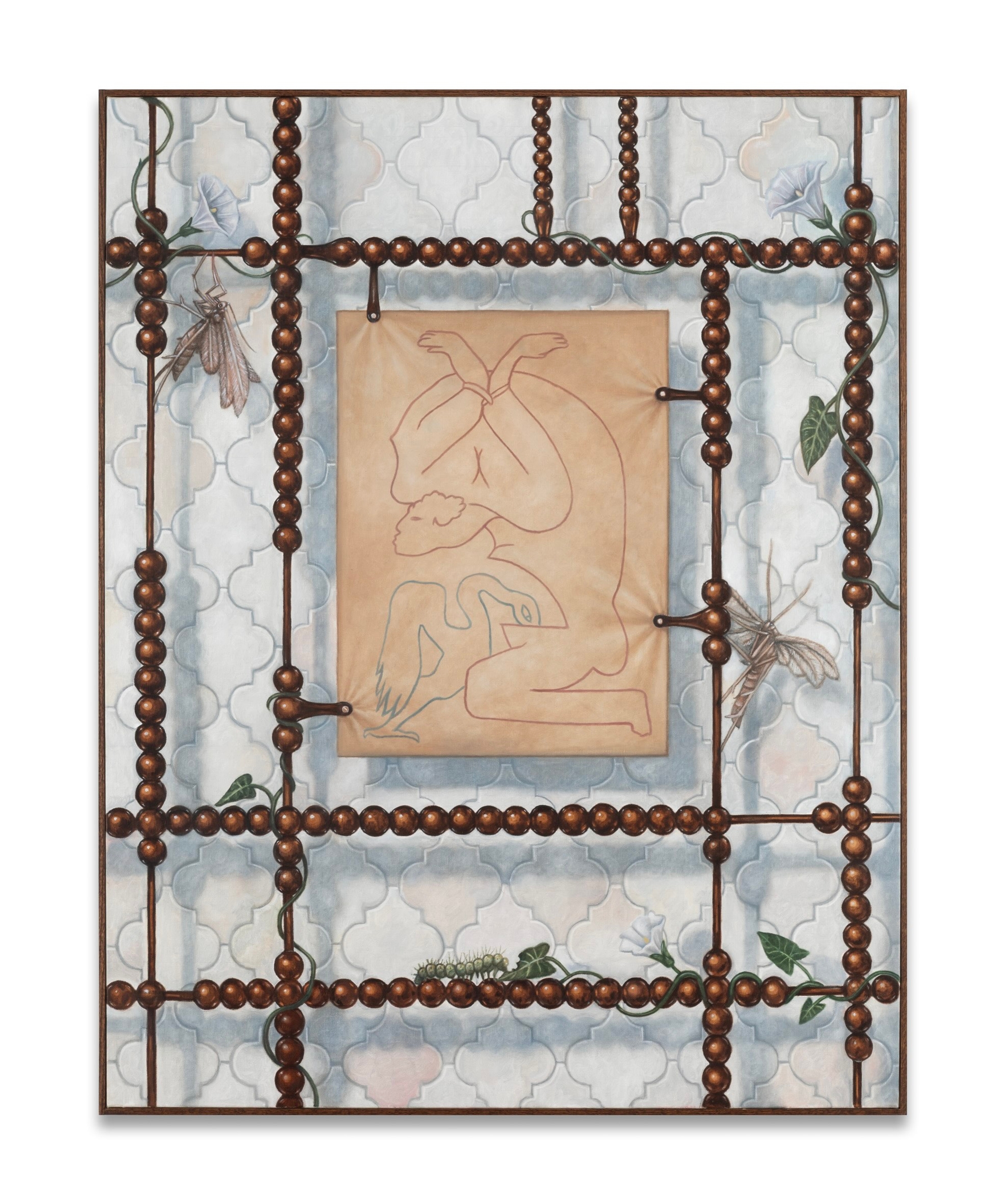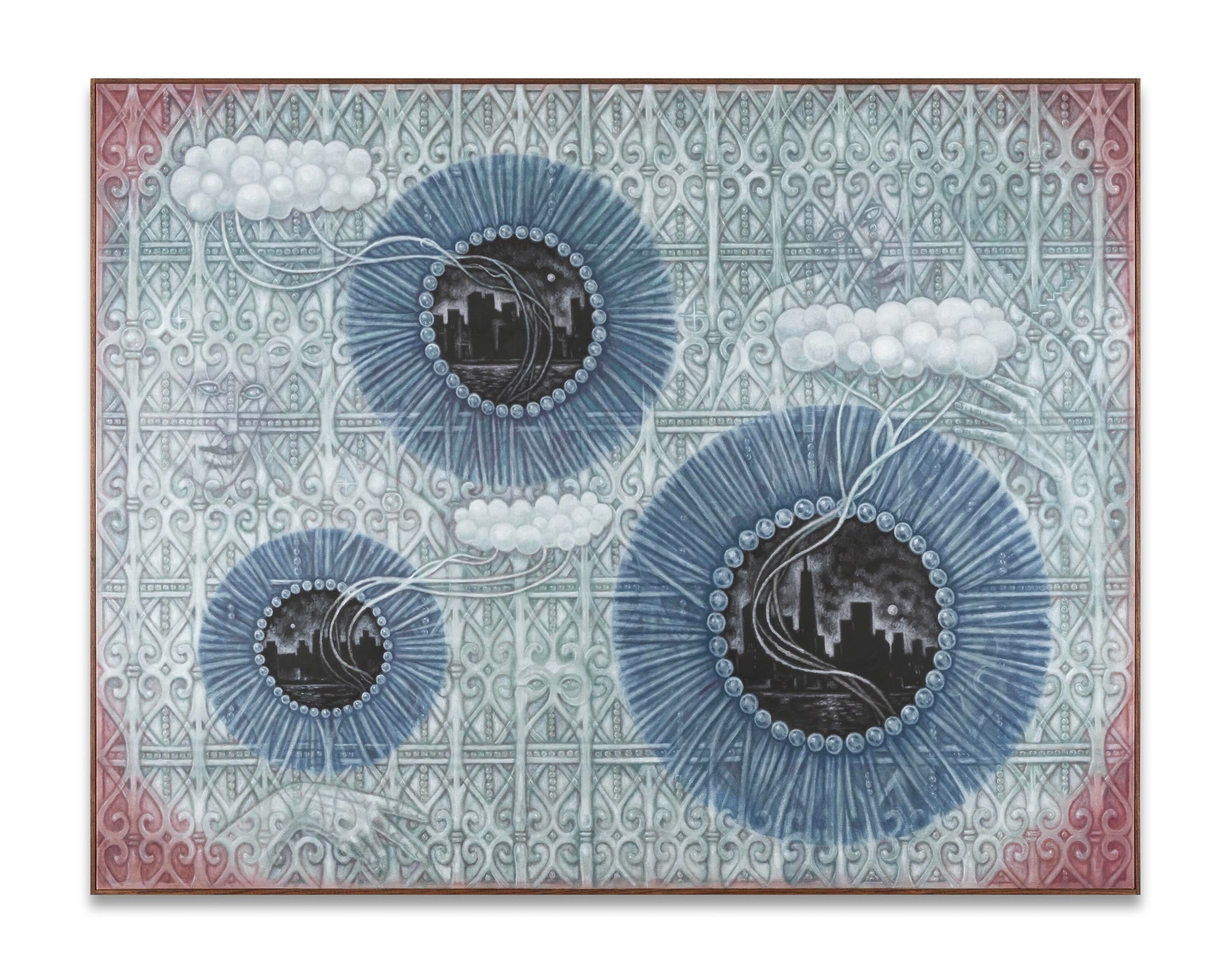Dans cette série de peintures, la complexité des motifs et l'obsession du détail suggèrent à la fois le plaisir et l'anxiété. Ils font écho aux stratégies visuelles de la Décadence, à sa fascination pour le déclin et ses visions apocalyptiques. Les formes, qu'elles soient architecturales ou organiques - nerfs de verre, fibres musculaires, orties, acide citrique et structures brisées- évoquent une matière marquée par la corrosion et le contact. Dans ces compositions, les ouvertures fonctionnent non pas comme des seuils à franchir, mais comme des espaces où demeurer. Elles rappellent, dans leur logique visuelle, les stigmates de la mystique catholique, ces éléments concrets qui invitent à la méditation.