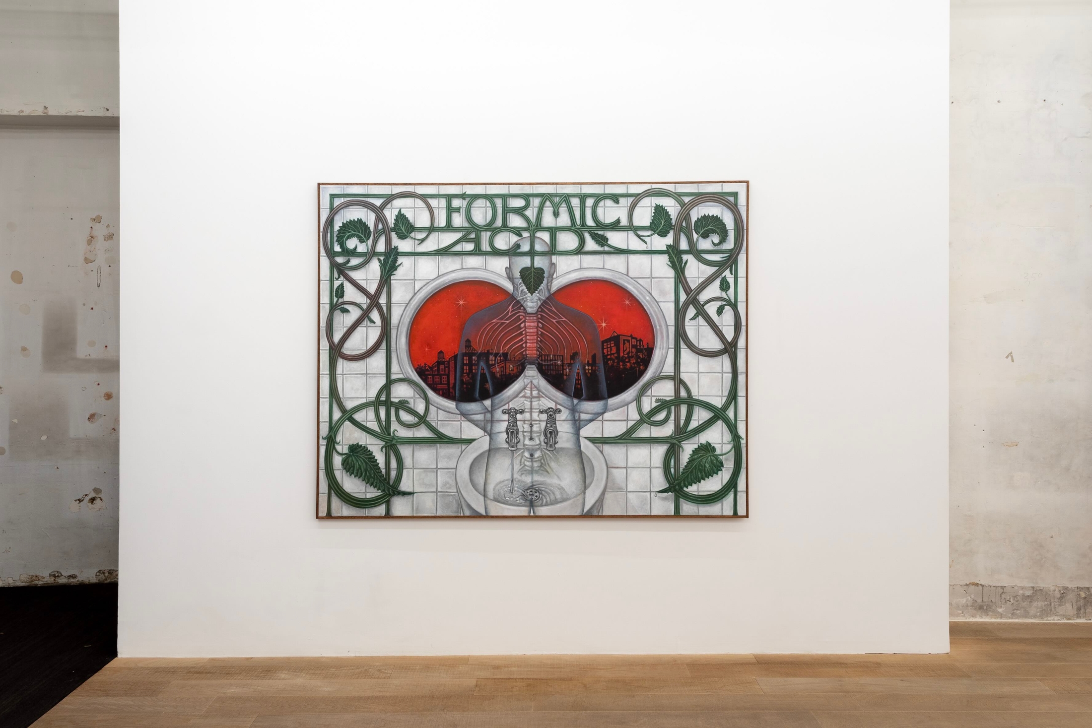 In the paintings, this theoretical account of bitterness takes on a material form. Dense patterning and obsessive detail, suggesting both pleasure and anxiety, echo the visual strategies of the Decadent movement, with its fascination for decline as well as its recurring apocalyptic visions. Organic and architectural forms -glass nerves, muscle fibres, stinging nettles, citric acid and fractured structures- evoke a materiality marked by corrosion and contact. Bodily and mechanical apertures function not as thresholds to cross but as spaces to dwell in and around, reflecting a visual logic akin to Catholic wound mysticism, a tangible point of meditation.